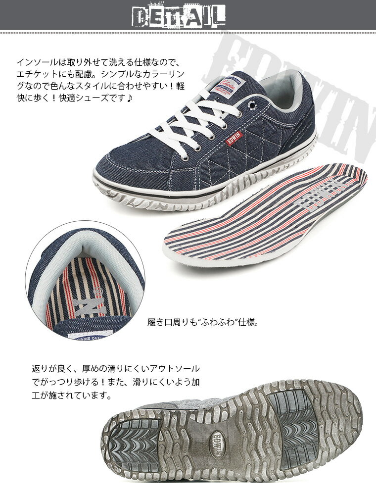 “Genuine Quality” EDWIN ローカットスニーカー! 厚めの滑りにくいアウトソールでがっつり歩ける! 27cm片足で約250gと非常に軽く、歩行時の足への負担を軽減し快適な足運びに。