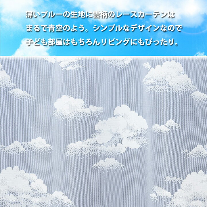 商品詳細 材質 本体:ポリエステル100% アジャスターフック(Aフック) サイズ 【幅100cm 2枚組】 100×98cm 100×133cm 【幅150cm 1枚】 150×176cm 150×198cm 150×218cm 製造国 日本 商品説明 ・薄いブルー生地の雲柄レースカーテンです。